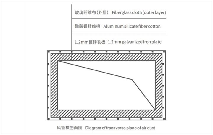 Estrutura: Chapa de aço galvanizado + envoltório flexível à prova de fogo de silicato de alumínio. O algodão de fibra de silicato de alumínio é reforçado com solução de silicato de sódio e o algodão de fibra de silicato de alumínio é colocado entre os flanges. Instalação: Fixe o envoltório flexível à prova de fogo de silicato de alumínio na placa de aço galvanizado com pregos de solda.